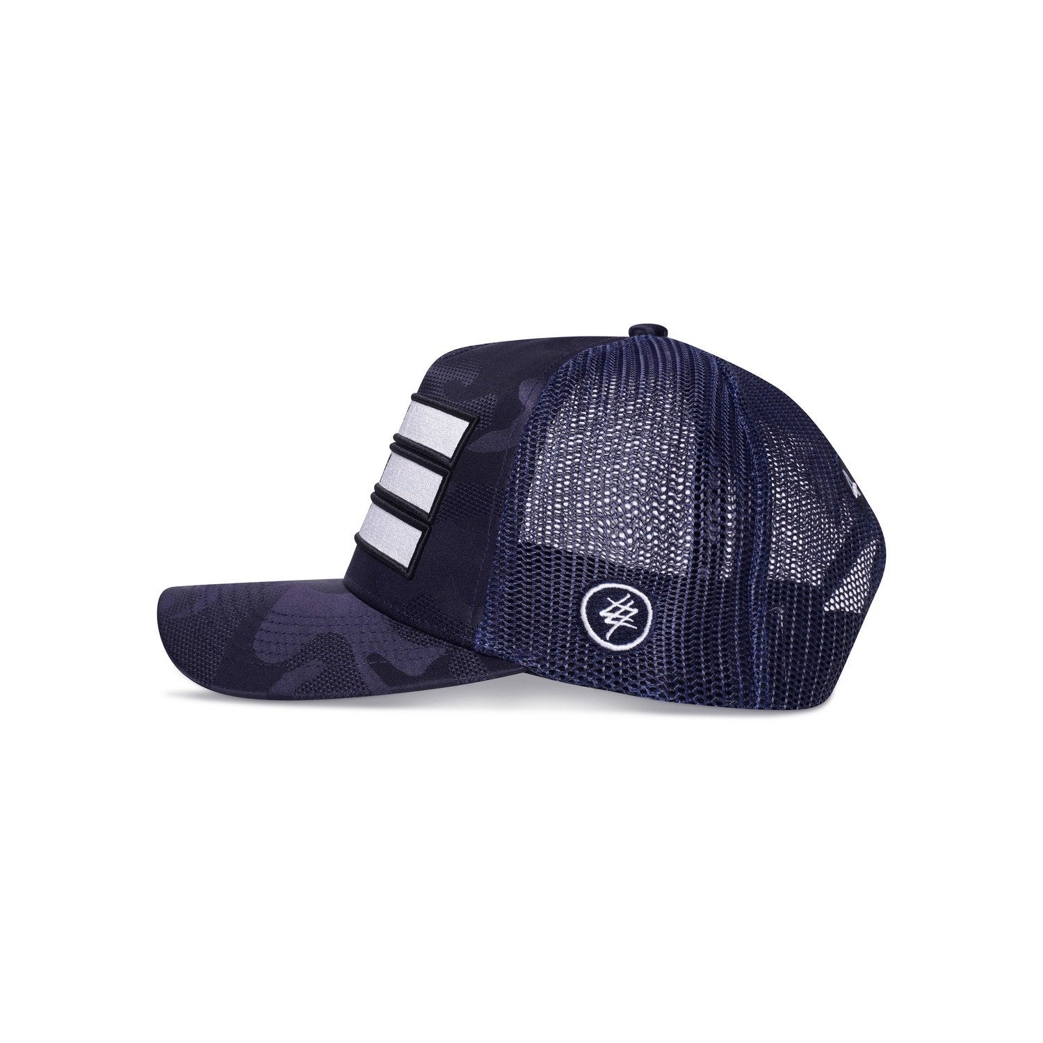 Our Navy Blue Camo Trucker is a must-have hat. The trucker hat features the iconic 474 3 bars on the front embroidered in white, ‘474’ logo to the side, finished in an all-blue camo design base layer and mesh back.
